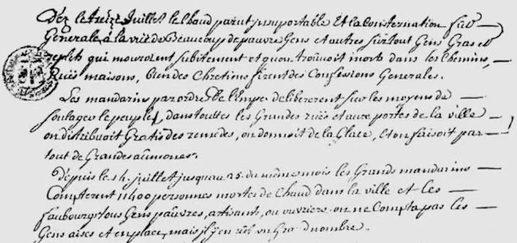 “7月14日至25日,北京近郊和城内已有11400人死于炎热。”“北京的老人称,从未见过这样的高温。”这是乾隆八年(1743年)法国传教士宋君荣寄往巴黎科学院的信里描述的北京。