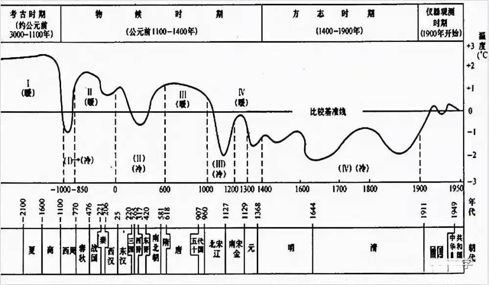 1972年,中国近代地理学和气象学奠基人竺可桢发表著作《中国近五千年来气候变迁的初步研究》,他将中国近5000年气温变化划分为史学、物候、方志和仪器观测四个时期,以中国古代王朝为线索,制成了一张气候曲线图——“竺可桢曲线”。