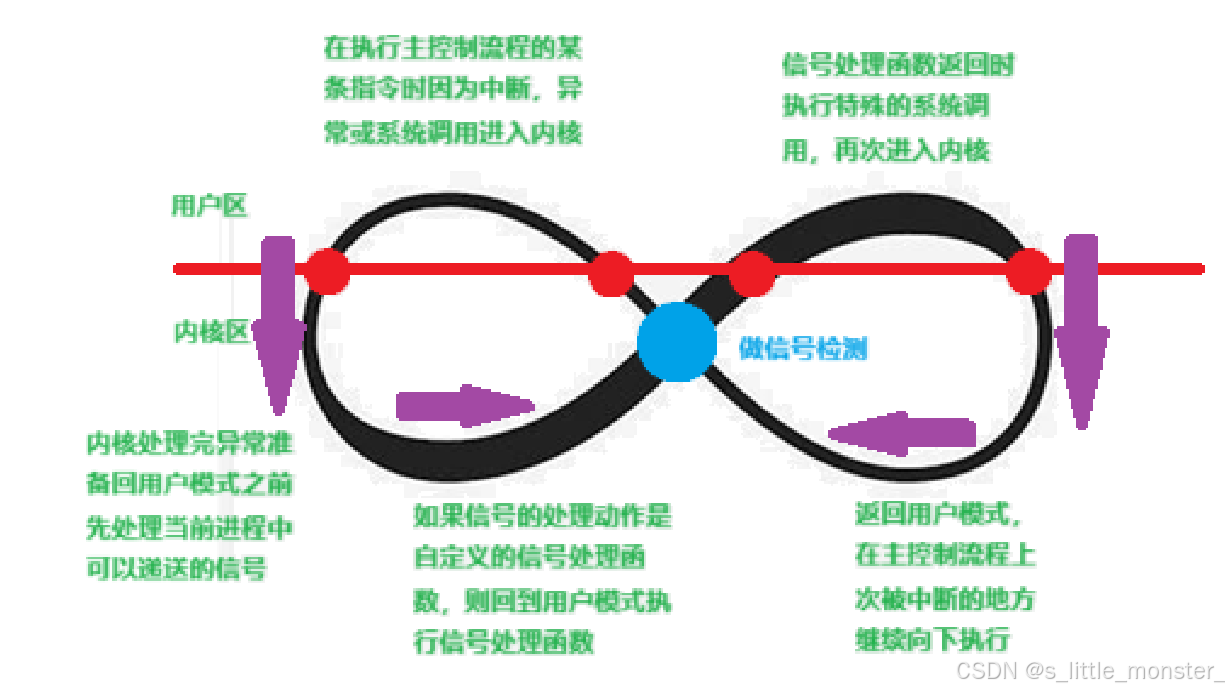 如果信号的处理动作是用户自定义函数,在信号递达时就调用这个函数,这称为捕捉信号,这个我们前面说过,但是我们的过程是比较复杂的,首先我们在执行主控制流程的某条指令时因为系统调用等原因会进入内核,然后内核处理完成后发送信号,如果信号的处理动作是自定义的信号处理函数就回到用户区执行信号处理函数,执行完之后因为信号处理函数的特殊性,它要再次进入内核区,然后回到用户模式继续执行