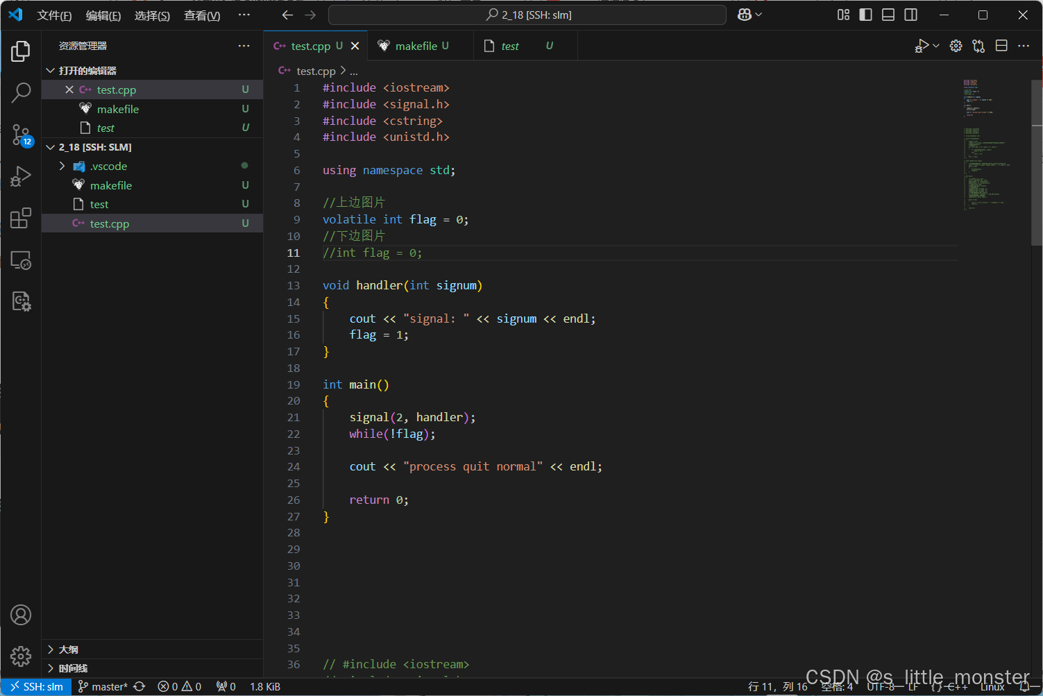 该程序在收到2号信号之前一直在while循环中啥也不干,收到2号信号执行handler打印,设置flag为1,然后继续while判断,从这里开始就变得不一样了