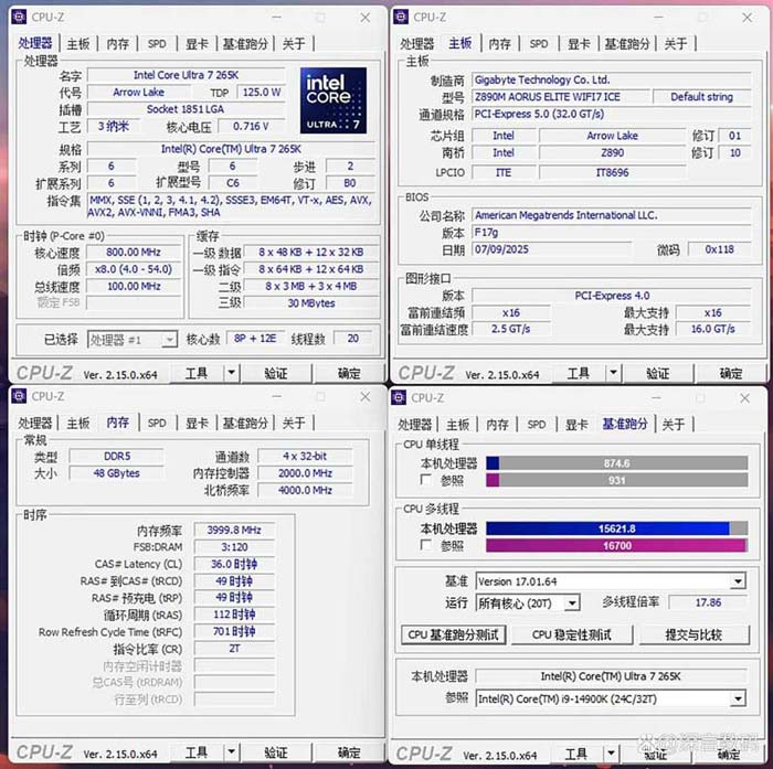 先简单过一遍Intel Ultra7 265K处理器的参数规格,其配备了20核20线程,8个性能核心和12个能效核心,这代处理器取消了超线程技术,计算模块用的是台积电N3B工艺,基础频率为3.9GHz,最大睿频可达5.5GHz,并拥有30MB的三级缓存,简单跑个CPU-Z基准性能测试,单核成绩为874.6分、多核成绩为15621.8分。