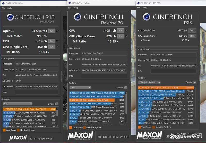 Intel Ultra7 265K处理器在CineBench R15基准测试软件中的多核成绩为5614分,单核成绩为350分,CineBench R20基准测试软件中的多核成绩为14051分,单核成绩为879分,而在CineBench R23基准测试软件中的多核成绩为35937分,单核成绩为2281分。