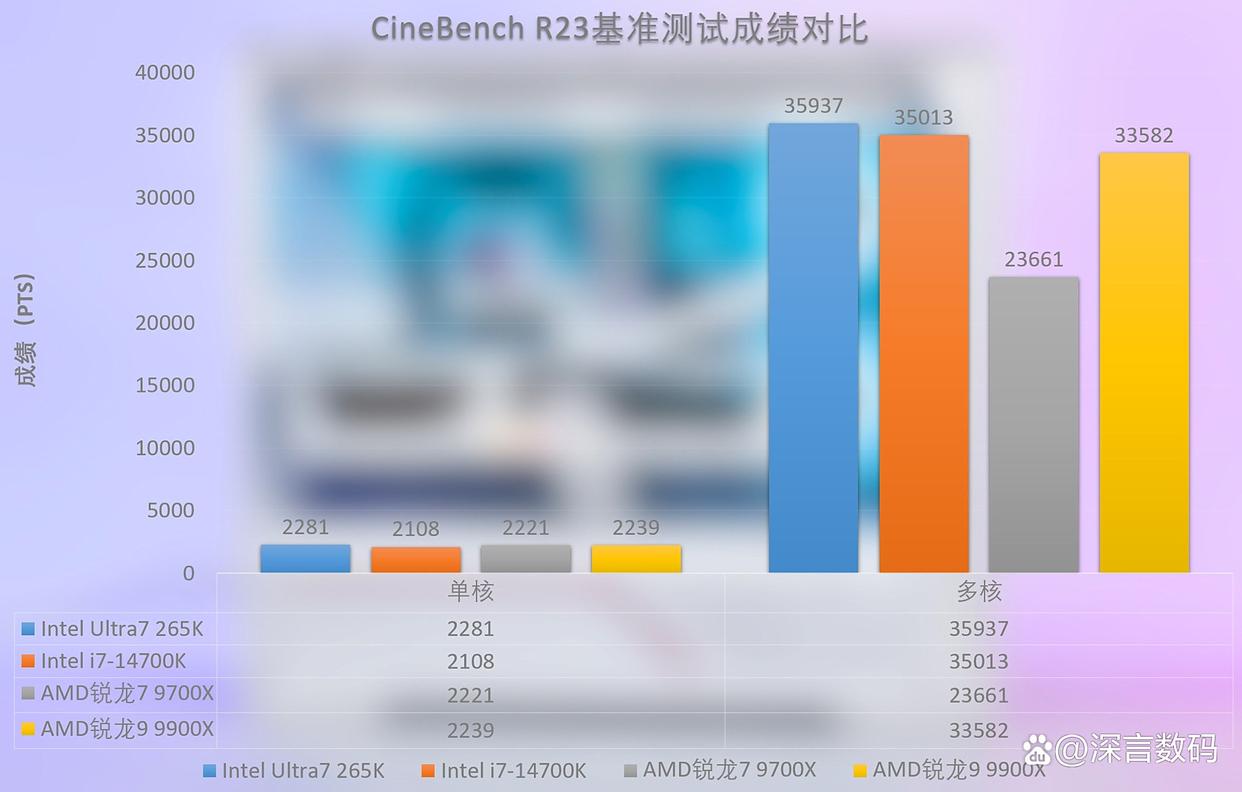 对比一下目前处于2000价位段的处理器的性能表现,从Cinebench R23软件测试成绩中可见,Intel Ultra7 265K在渲染生产力方面更胜一筹,与同样是20核心的i7-14700K处理器相比性能差距并不大,不过Ultra7 265K的满载功耗更低,新架构支持高频内存条,核显编解码性能更强。