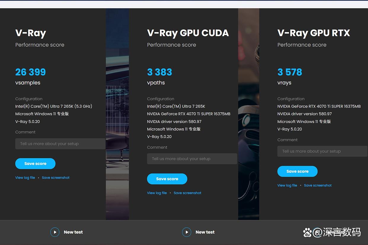 V-Ray 5.0渲染基准测试软件,软件提供了三种不同的渲染模式,可支持处理器、GPU与混合渲染模式,其中处理器单独渲染模式成绩为26399分,GPU与混合渲染模式目前仅兼容RTX GPU加速,GPU单独渲染模式成绩为3578分,混合渲染模式成绩为3383分。
