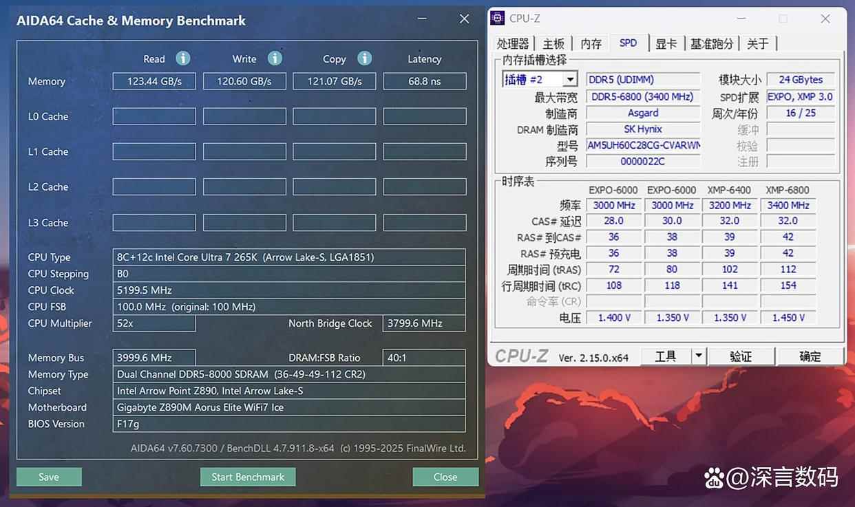 内存性能对Intel Ultra200平台有着较为明显的影响,本次将内存条超频至8000MT/s时序为CL36,优化了部分内存小参并能够通过压力测试,利用AIDA 64软件的内存基准测试功能,实测内存读取速度为123.44GB/s,写入速度为120.6GB/s,复制速度为121.07GB/s,延迟为68.8ns。