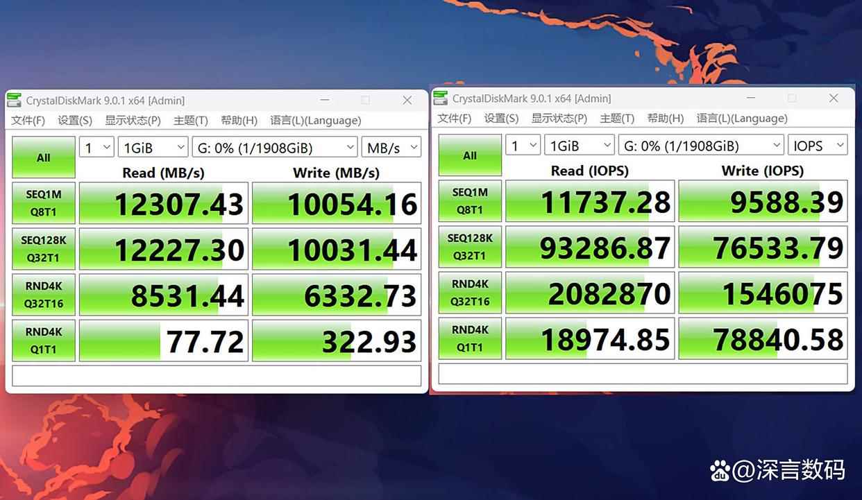 主板上首个M.2固态硬盘插槽支持PCIe5.0×4传输规格,由于接口是从处理器的IOE模块引出,会出现在Intel Ultra200平台的固态硬盘测速结果低于预期,本次搭配宏碁掠夺者GM9 PCIe5.0固态硬盘,顺序读取写入速度分别为12307MB/s与10054MB/s,4K单线程读写速度分别为77.72MB/s与322.93MB/s。