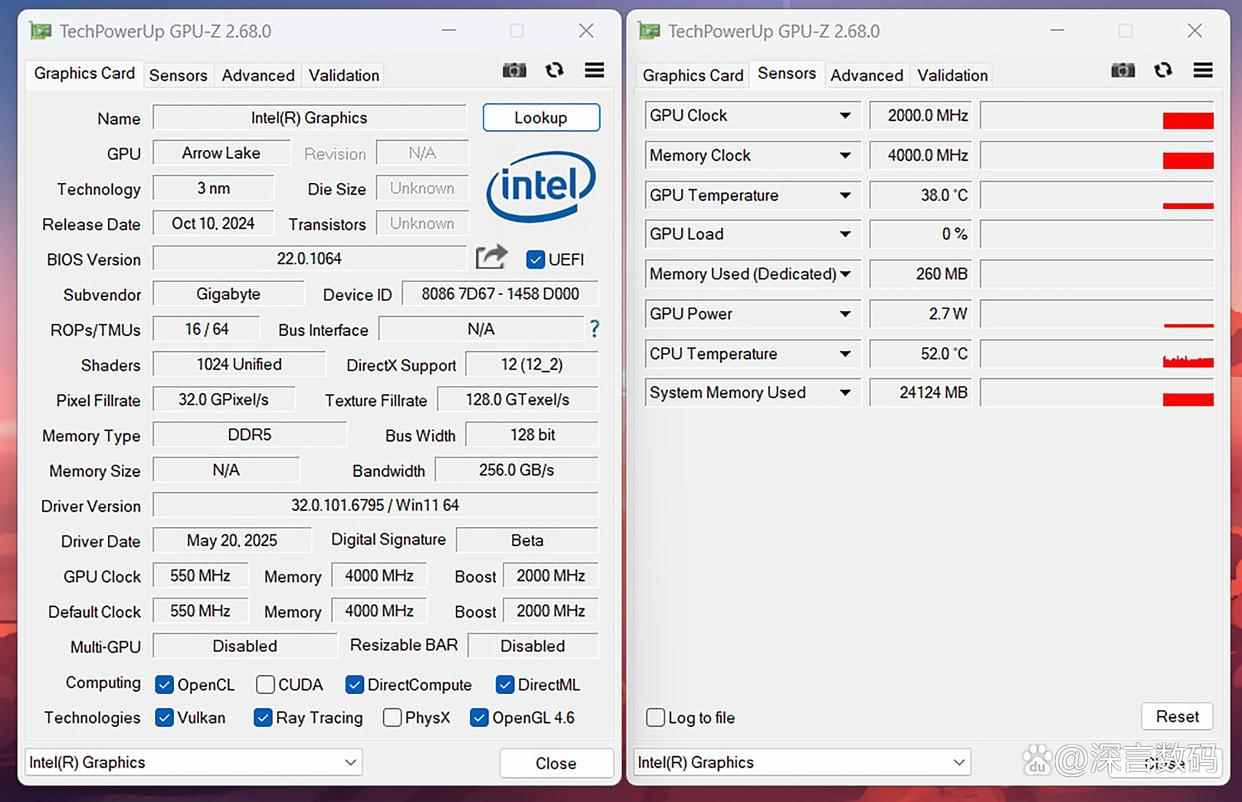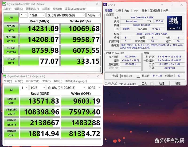 这代Intel Ultra桌面处理器的变化很大,仍是大小核架构设计,不过取消了超线程技术,相较于14代酷睿处理器最大升级的是配备独立NPU模块,Ultra7 265K处理器的NPU模块算力达13TOPS,然后是能耗比,采用先进的台积电的N3B制程工艺,在性能更高的同时满载功耗与温度下降了,在拓展性方面也更强,支持更高内存频率,并增加四条PCIe5.0通道用于安装固态硬盘。