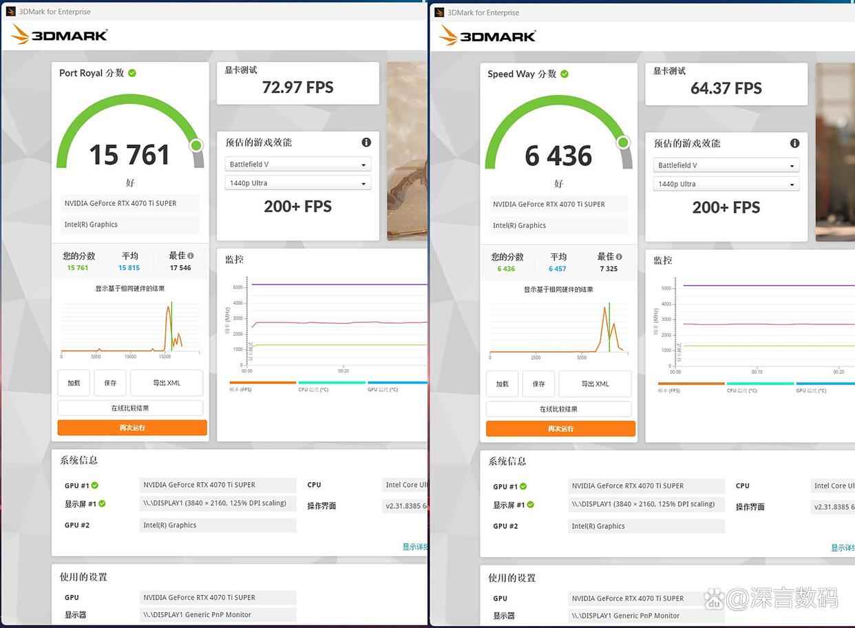 显卡的光线追踪性能测试,RTX4070Ti Super 16GB显卡在Port Royal项目的总得分为15761分,显卡测试帧率为72.97FPS,而在Speed Way项目的总得分为6436分,显卡测试帧率为64.37FPS。