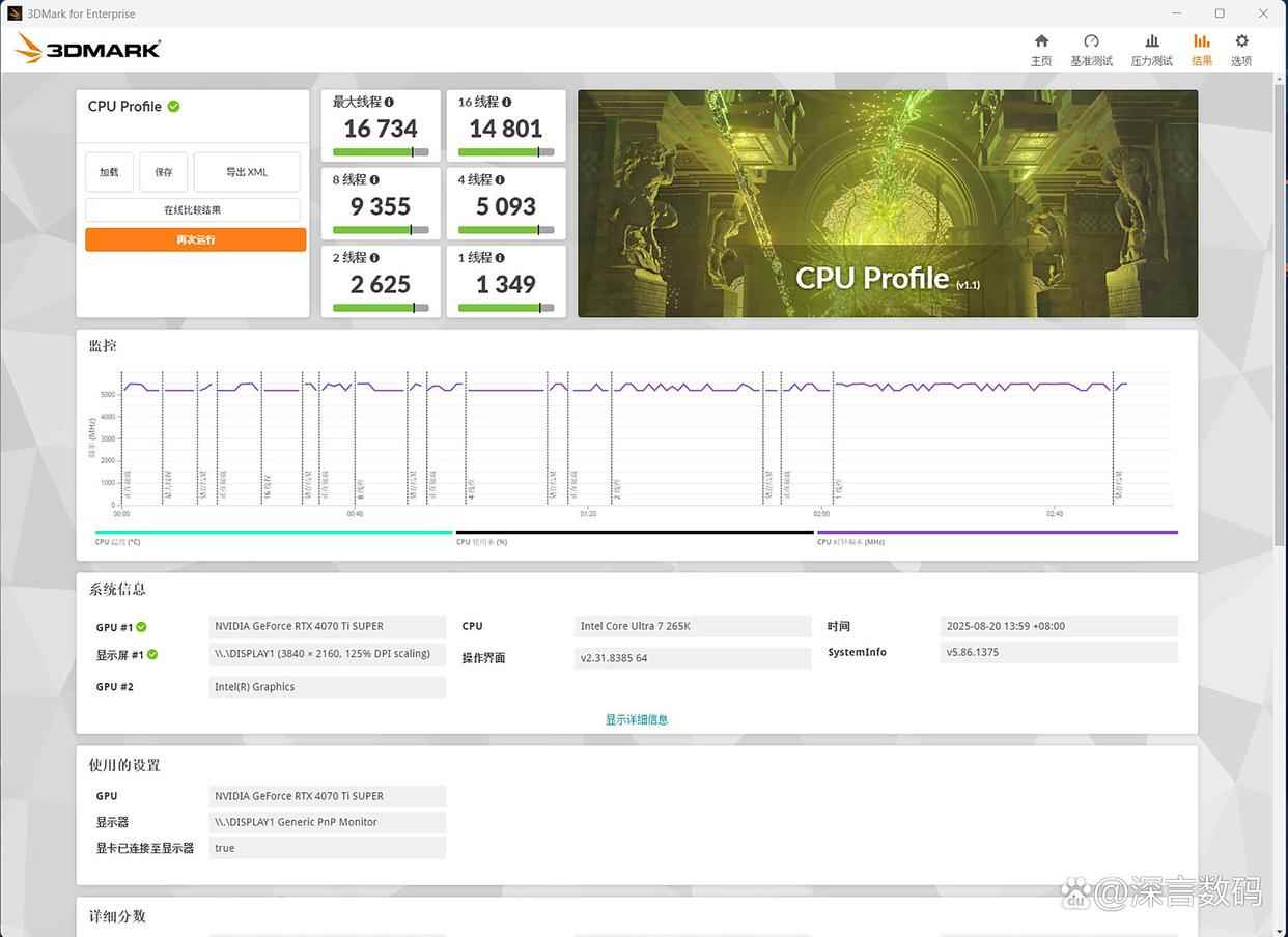 CPU Profile测试项目,可测试处理器在不同线程数下性能表现,Intel Ultra7 265K处理器的最大线程成绩为16734分,16线程成绩为14801分,8线程成绩为9355分,2线程成绩为2625分,单线程成绩为1349分。