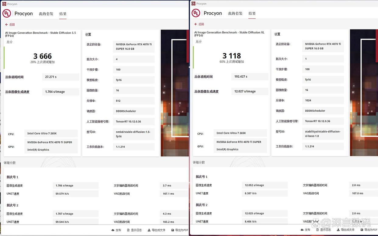 AI图像生成性能测试,其基于Stable Diffusion模型,本次选择的人工智能推理引擎版本为TensorRT,在Stable Diffusion 1.5(512×512)项目中的成绩为3666分,总体图像生成速度为1.704s/image,在Stable Diffusion XL(1024×1024)项目中的得分为3118,总体图像生成速度为12.027s/image。