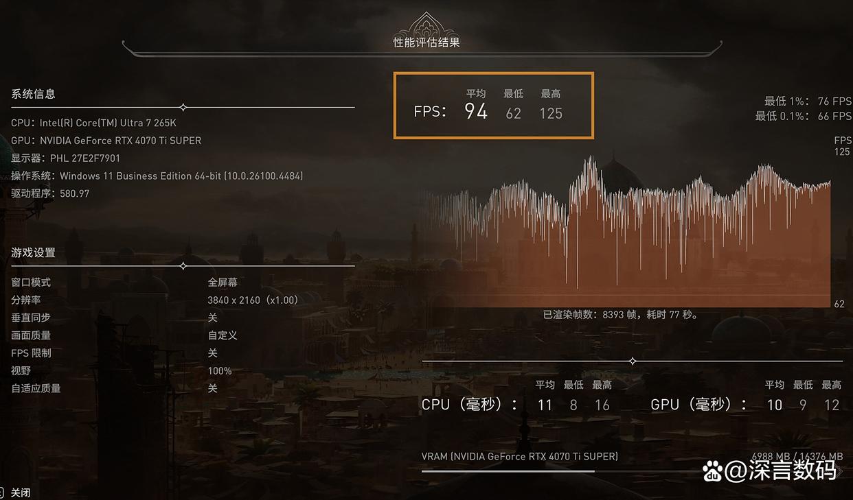 接下来是游戏性能测试环节,RTX4070Ti Super 16GB显卡能够实现在4K分辨率下高帧率运行大型游戏,因此本次测试均在4K分辨率(3840×2160)画面设定下进行,《刺客信条:幻景》画面质量设为极高预设档位,关闭自适应质量模式,其它画质选项均为默认,内置基准测试功能实测平均帧率为94FPS,1%Low帧率为76FPS。