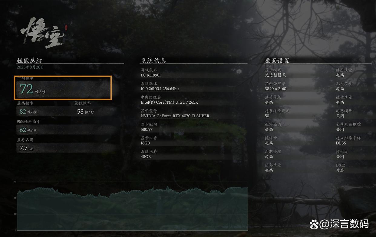 在《黑神话:悟空》游戏中选择应用推荐画质等级,即关闭光线追踪效果,开启DLSS超分辨率采样,超采样清晰度设为50,其它画质选项均设为超高,关闭帧生成功能的设定下平均帧率为72FPS,最低帧率为58FPS,若是开启帧生成功能,平均帧率会提高至114FPS。