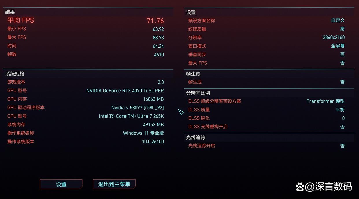 《赛博朋克2077》将画质设为超级预设档位,然后手动切换至DLSS超分辨率采样与平衡档位,选择全新的Transformer模型,关闭帧生成功能,其它画质参数均保持默认,在基准测试中平均帧率为71.76FPS,最小帧率为63.92FPS。