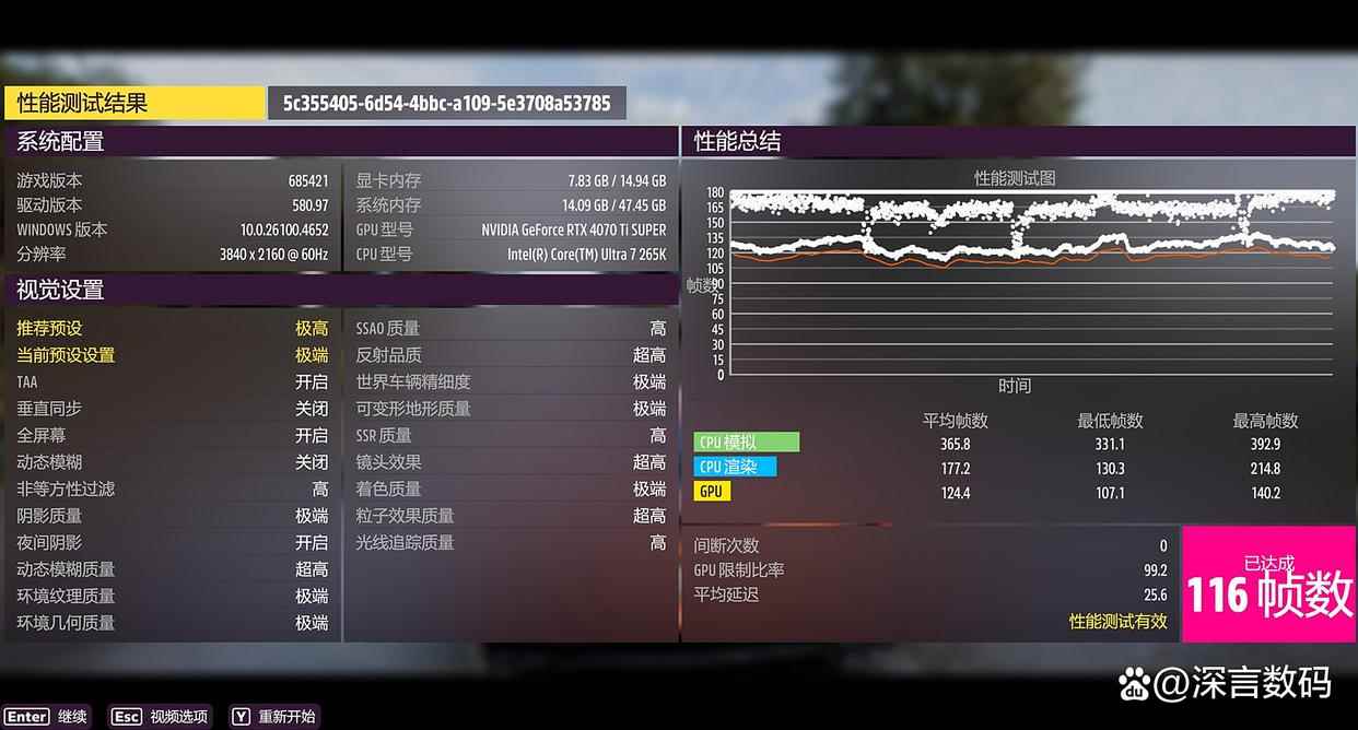 《极限竞速:地平线5》关闭超分辨率采样,开启TAA抗锯齿效果,将画质设为最高极端预设档位,全部画质参数均保持默认,在内置的基准测试中平均帧率为116FPS,若追求画质可将光线追踪等全部效果拉满,此时平均帧率为93FPS。