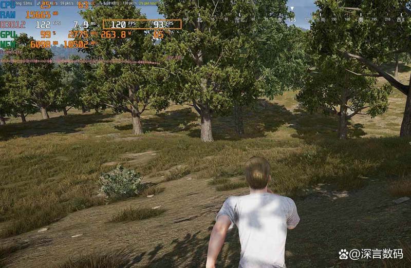 竞技类游戏《PUBG》,将画质设为预设超高画质档位,全部参数保持默认,DirectX版本设置为DX12,地图为艾伦格单排赛,在游戏地图中不停奔跑,实测平均帧率为120FPS,1%Low帧率为93FPS。
