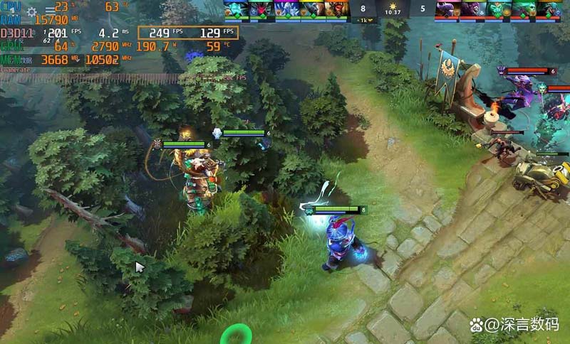 《DOTA2》已解锁帧率上限,将画质设为预设最高画质档位,在观战十分钟情况下,实测平均帧率为249FPS,1%Low帧率为129FPS,该游戏对处理器单核性能有近乎苛刻的要求,除非团战等高负载场景,显卡负载基本处于70%。
