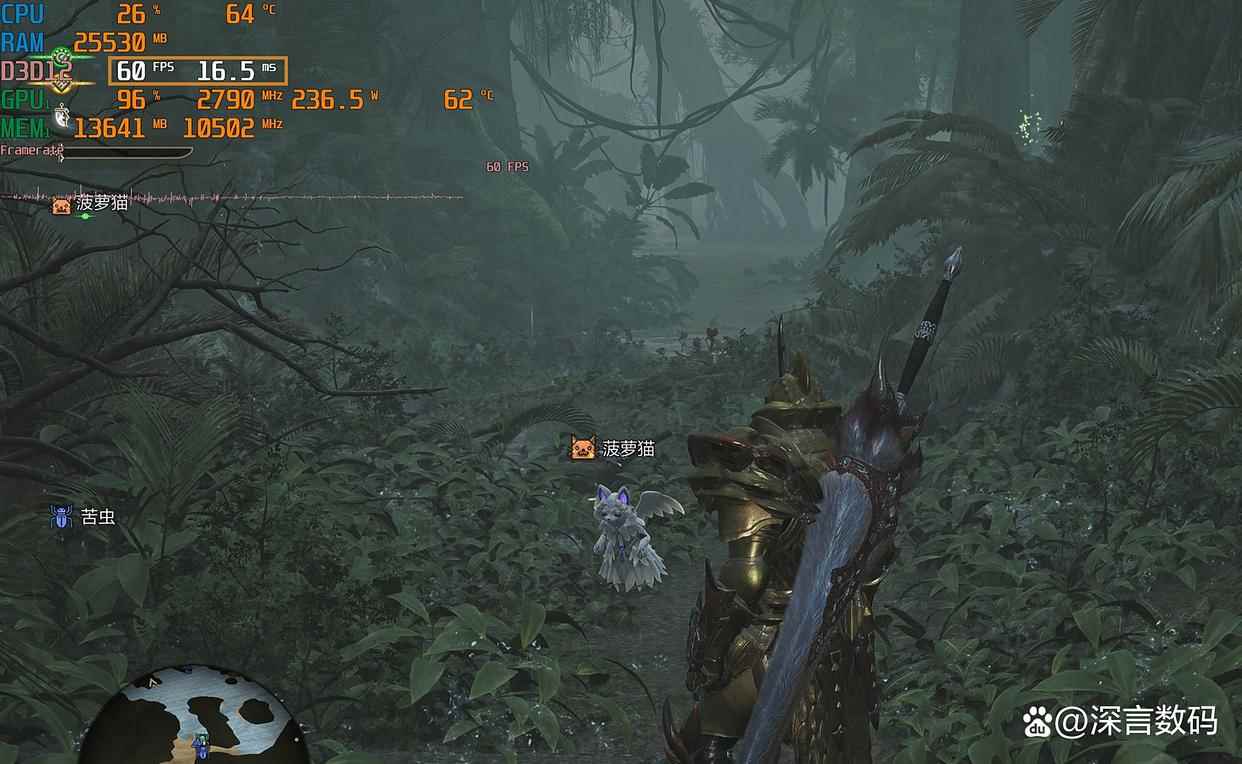 《怪物猎人:荒野》,将画质设为预设极高画质档位,默认开启DLSS超分辨率采样与画质档位,并启用高分辨率纹理包,游戏场景为渲染压力较高的绯红森林地图,游戏帧率为60FPS。
