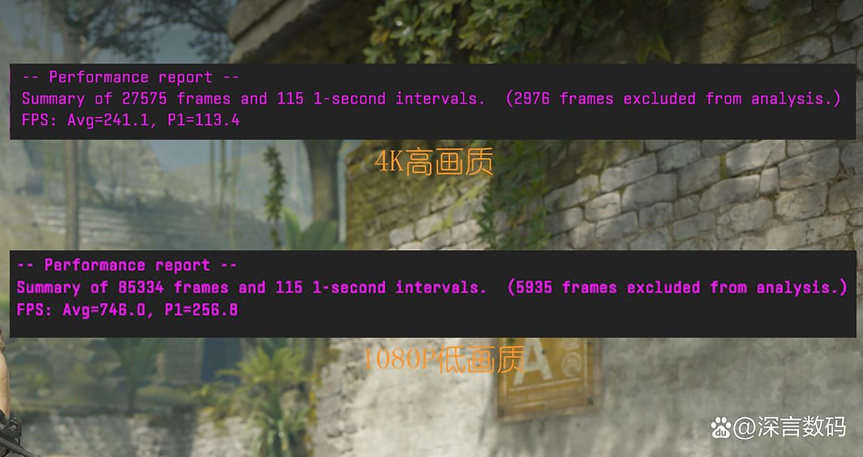 竞技类游戏《CS2》,使用创意工坊内的基准测试地图,测试4K与1080P分辨率的表现,先测试1080P低档位画质,实测平均游戏帧率为746FPS,1%Low帧为256.8FPS,而4K分辨率高档位画质平均游戏帧率为241.1FPS,1%Low帧为113.4FPS。