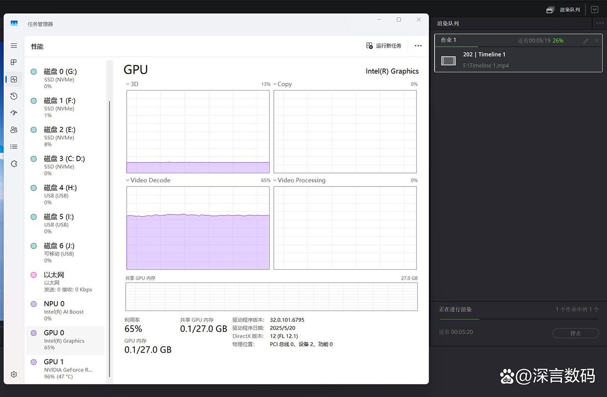 Intel Ultra7 265K处理器核显的视频编解码能力相当强大,可用于视频内容创作等场景,比如使用达芬奇软件导出4K分辨率AV1格式视频时,Ultra7 265K处理器的核显与独立显卡协同工作,从系统的资源管理器中可看到此时核显占用率为65%,尤其是预览导出高分辨率视频时,渲染速度得到一定提升,相较于关闭核显状态下,视频导出时间减少了30秒。