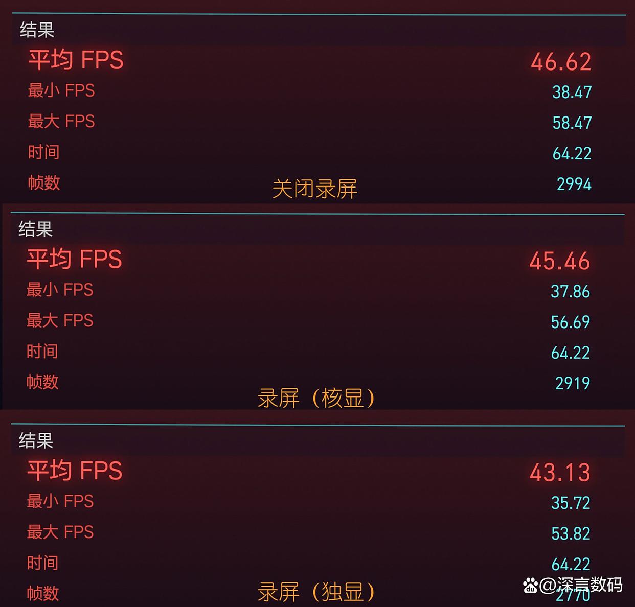 对比软件分别调用核显与独显两种模式下录制游戏视频对帧率的影响,录制视频为H.264编码格式,画面分辨率为4K帧率为30FPS,在调用处理器的核显进行视频编解码状态下,游戏平均帧率仅下降1FPS,而在调用独显的进行视频编解码状态下,游戏平均帧率下降了3FPS。