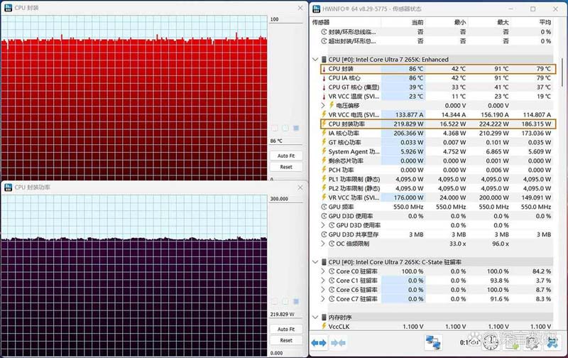 主板BIOS中性能模式选了Optimization,处理器核心电压策略较为激进,会导致满载时核心电压与功耗偏高,需要在主板BIOS中设定合理的电压值,或者切换至更为保守的性能模式,本次手动将处理器核心电压设为1.35V,完全不会影响性能发挥同时有效降低温度,在烤机状态下满载功耗为220W,温度维持在86℃。